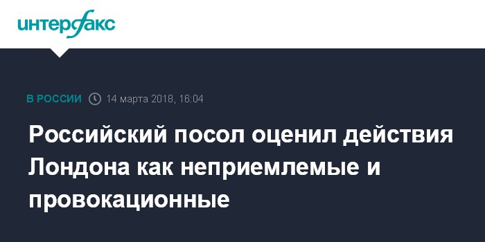 Москва. 14 марта. INTERFAX.RU - Действия Великобритании в связи с "делом Скрипаля" неприемлемы, Москва расценивает их как провокацию, заявил посол РФ в Лондоне Александр Яковенко.