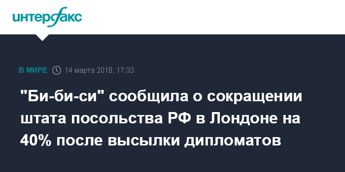 Москва. 14 марта. INTERFAX.RU - Объявленная в среду премьер-министром Великобритании Терезой Мэй высылка российских дипломатов приведет к сокращению дипломатического состава посольства РФ в Лондоне приблизительно на 40%, сообщает "Би-би-си".