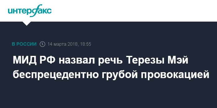 "Заявление премьер-министра Великобритании Терезы Мэй в парламенте 14 марта о мерах "наказания" России под фальшивым предлогом о якобы причастности к отравлению Сергея Скрипаля и его дочери расцениваем как беспрецедентно грубую провокацию, подрывающую основы нормального межгосударственного диалога между нашими странами", - говорится в заявлении, опубликованном в среду на сайте российского МИД.