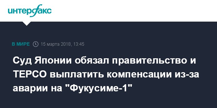 Москва. 15 марта. INTERFAX.RU - Окружной суд Киото обязал правительство и крупнейшую энергетическую компанию страны - оператора электростанции Tokyo Electric Power Co (TEPCO) выплатить 110 подданным Японии, которые были вынуждены покинуть свои дома из-за аварии на АЭС "Фукусима-1" в 2011 году, около $1,04 млн, сообщает в четверг агентство "Дзидзи".