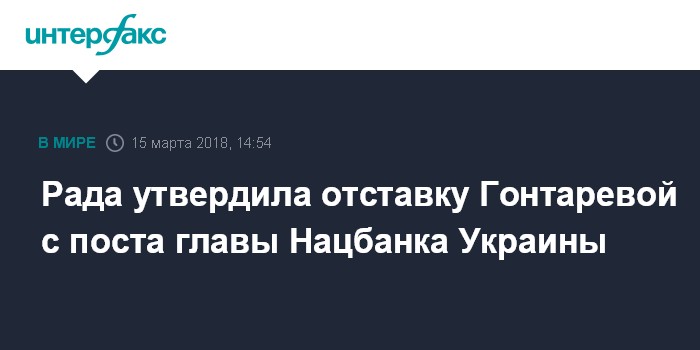 Москва. 15 марта. INTERFAX.RU - Верховная рада Украины на заседании в четверг утвердила отставку руководителя Нацбанка Украины (НБУ) Валерии Гонтаревой.