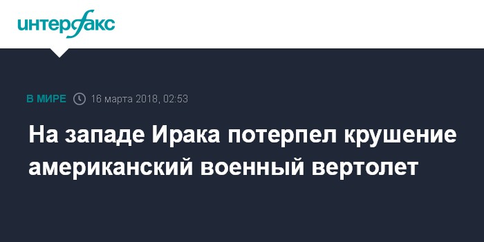 Москва. 16 марта. INTERFAX.RU - Американский военный вертолет потерпел крушение на западе Ирака недалеко от сирийской границы, сообщил телеканал CNN со ссылкой на возглавляемую США коалицию.