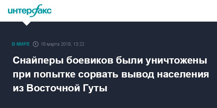 Москва. 16 марта. INTERFAX.RU - Уничтожены снайперы боевиков, которые пытались помешать выходу населения из Восточной Гуты, сообщили российские военные.