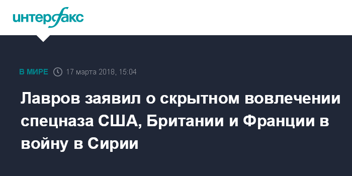 Москва. 17 марта. INTERFAX.RU - Спецназ Великобритании и Франции скрыто работает на территории Сирии наряду с американским, это прямое вовлечение этих сил в конфликт, заявил глава МИД России Сергей Лавров.