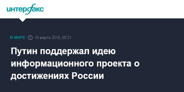 Москва. 19 марта. INTERFAX.RU - Владимир Путин поддержал идею информационного проекта, направленного на популяризацию достижений России, который решили реализовать волонтеры его избирательного штаба.