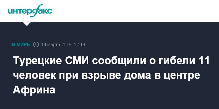Москва. 19 марта. INTERFAX.RU - Семь мирных жителей и четыре бойца оппозиционной Сирийской свободной армии (ССА) погибли в результате подрыва мощного взрывного устройства в четырехэтажном доме в центре Африна на севере Сирии, сообщают в понедельник турецкие СМИ.
