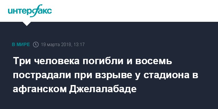 Москва. 19 марта. INTERFAX.RU - Три человека погибли, еще восемь человек получили ранения в результате теракта в городе Джелалабад, административном центре провинции Нангархар на востоке Афганистана, сообщает телеканала Tolo News со ссылкой на представителей местных властей.