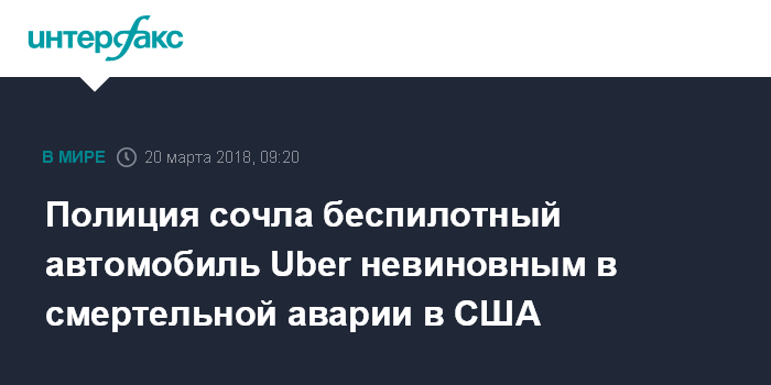 Москва. 20 марта. INTERFAX.RU - Полиция пригорода Финикса Темпе (штат Аризона, США), по предварительным данным, не находит признаков вины беспилотного автомобиля Uber в ДТП с гибелью женщины. Об этом сообщает газета San Francisco Chronicle со ссылкой на главу полиции Темпе Сильвию Моир.