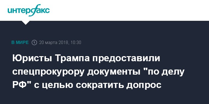 Москва. 20 марта. INTERFAX.RU - Адвокаты президента США Дональда Трампа предоставили команде спецпрокурора Роберта Мюллера, ведущего расследование по так называемому "российскому делу", ряд документов, сообщила в ночь на вторник американская газета The Washington Post со ссылкой на информированные источники.