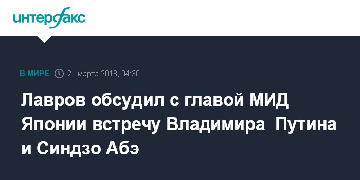 Москва. 21 марта. INTERFAX.RU - Глава МИД РФ Сергей Лавров назвал запланированную на май этого года встречу лидеров Японии и России Синдзо Абэ и Владимира Путина главным событием для отношений двух стран.