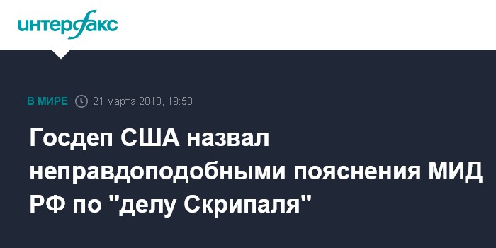 Москва. 21 марта. INTERFAX.RU - В Госдепартаменте США считают неправдоподобными российские пояснения по делу об отравлении экс-сотрудника ГРУ Сергея Скрипаля.