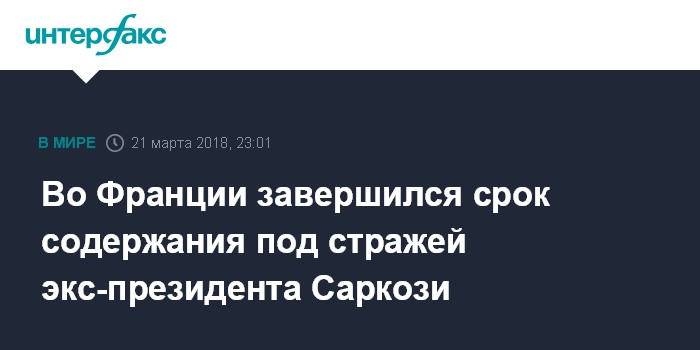 Москва. 21 марта. INTERFAX.RU - Срок содержания под стражей бывшего президента Франции Николя Саркози завершился в среду вечером, сообщают парижские СМИ.