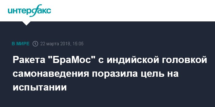 "Сегодня проведены испытания крылатой ракеты "БраМос" с головкой самонаведения индийского производства", - говорится в сообщении совместного предприятия (СП), распространенном в четверг.