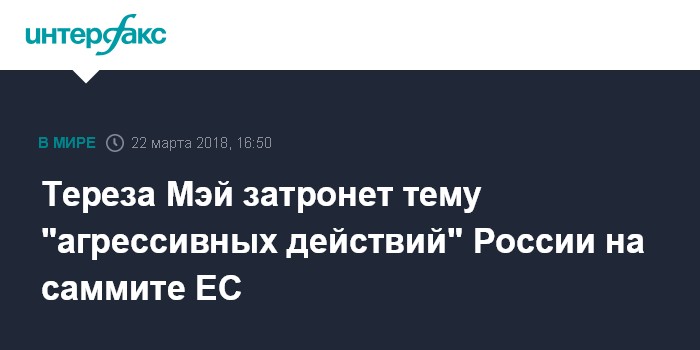 Москва. 22 марта. INTERFAX.RU - Премьер-министр Великобритании Тереза Мэй заявила в четверг, что в ходе двухдневного саммита лидеров ЕС планирует обсудить тему российских "агрессивных действий", направленных против Европы и ее соседей.