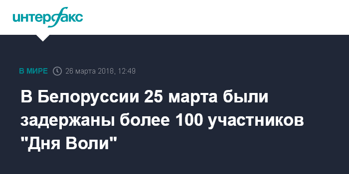 Москва. 26 марта. INTERFAX.RU - В Белоруссии накануне было задержано более 100 участников акций в рамках "Дня Воли", сообщает незарегистрированный в республике правозащитный центр "Весна".