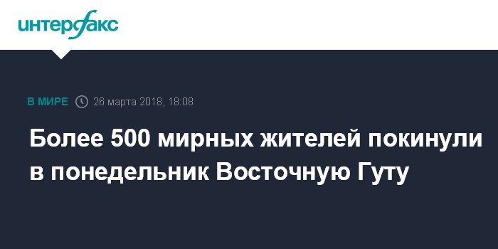 Москва. 26 марта. INTERFAX.RU - Более 520 мирных жителей покинули в понедельник Восточную Гуту по гуманитарному коридору в населенном пункте Мухайям Аль-Вафедин, сообщает российский Центр по примирению враждующих сторон.