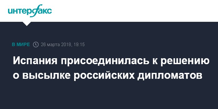 Москва. 26 марта. INTERFAX.RU - Испания вышлет российских дипломатов в качестве ответных мер в связи с отравлением экс-полковника ГРУ Сергея Скрипаля и его дочери Юлии в британском Солсбери, сообщает агентство Europa Press.