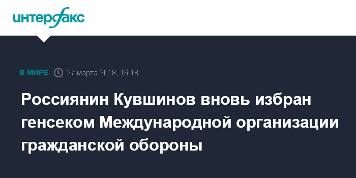 Москва. 27 марта. INTERFAX.RU - Представитель России Владимир Кувшинов вновь избран генеральным секретарем Международной организации гражданской обороны (МОГО).
