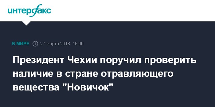 Москва. 27 марта. INTERFAX.RU - Президент Чехии Милош Земан поручил Службе безопасности и информации (контрразведке) выяснить "возможность наличия или складирования на чешской территории отравляющего вещества типа "Новичок"", которым, по утверждениям британской стороны, был отравлен бывший сотрудник ГРУ Сергей Скрипаль.