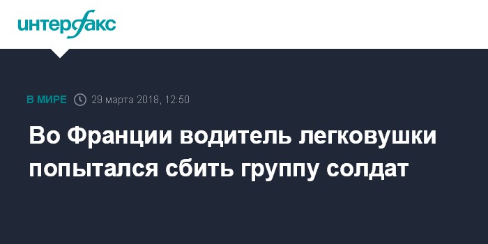 Москва. 29 марта. INTERFAX.RU - Водитель автомобиля Peugeot 208 попытался наехать на группу солдат на юго-востоке Франции, сообщает "Би-би-си".