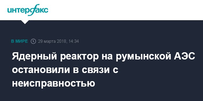 Москва. 29 марта. INTERFAX.RU - Один из ядерных реакторов на атомной электростанции "Чернаводэ" в Румынии был отключен от энергетической системы из-за технических неполадок, сообщают в четверг западные СМИ со ссылкой на компанию-оператора станции.