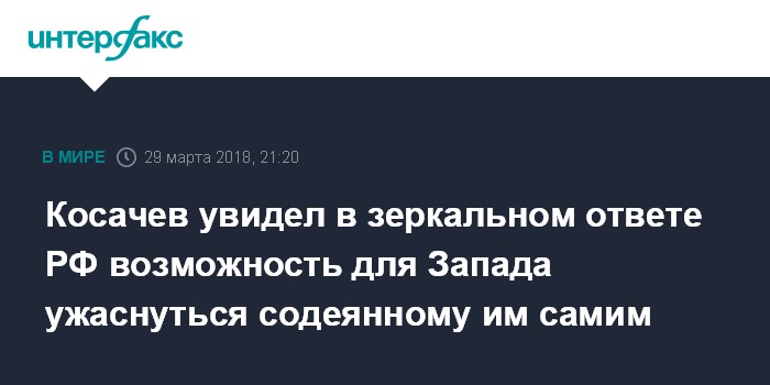 "С самого начала считал зеркальность главным принципом российской реакции на происходящее. Наши оппоненты должны иметь возможность посмотреть на себя в зеркало, чтобы ужаснуться увиденному и содеянному с их стороны", - сказал Косачев "Интерфаксу", комментируя ответ Москвы на действия Вашингтона в связи с "делом Скрипаля".
