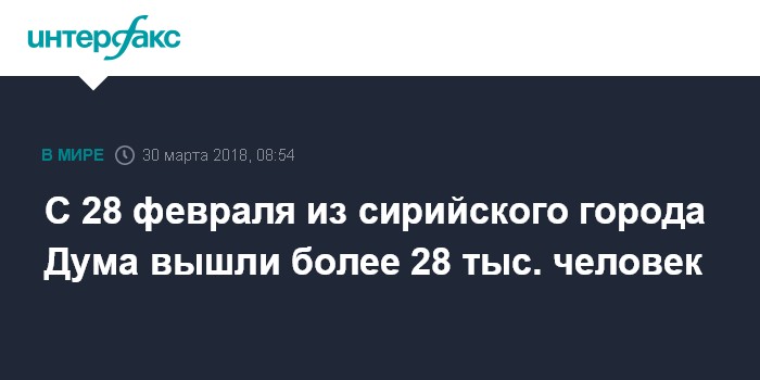"Всего с 28 февраля из сирийского города Дума вышли 28 495 человек", - говорится в сообщении, поступившем в "Интерфакс".