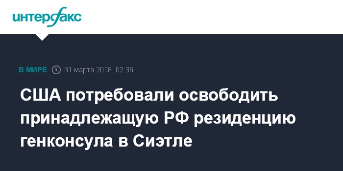 Москва. 31 марта. INTERFAX.RU - Американские власти потребовали освободить резиденцию российского генконсула в Сиэтле, которая находится в собственности РФ, сообщил в пятницу посол России в США Анатолий Антонов.