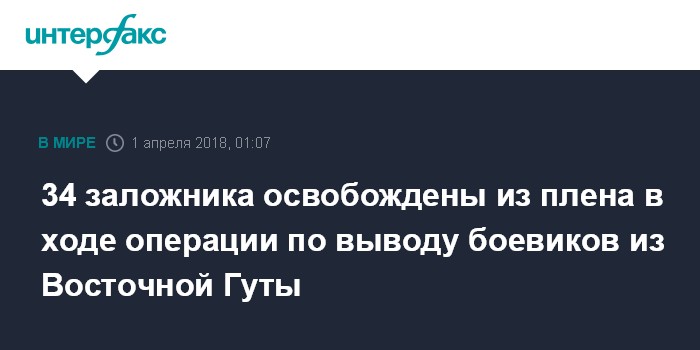 Москва. 1 апреля. INTERFAX.RU - Свыше 30 заложников были освобождены из плена в результате операции по выводу боевиков группировки "Фейлак Ар-Рахман" из Восточной Гуты, заявил начальник российского Центра примирения враждующих сторон в Сирии Юрий Евтушенко.