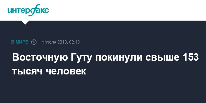 Москва. 1 апреля. INTERFAX.RU - Более 153 тысяч человек покинули Восточную Гуту за время действий гуманитарных пауз, заявил, заявил начальник российского Центра примирения враждующих сторон в Сирии Юрий Евтушенко.