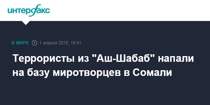 Москва. 1 апреля. INTERFAX.RU - Боевики из террористической группировки "Аш-Шабаб" совершили нападение на базу миротворцев из Организации африканского единства в Сомали, сообщают в воскресенье СМИ со ссылками на источники в армейских кругах.