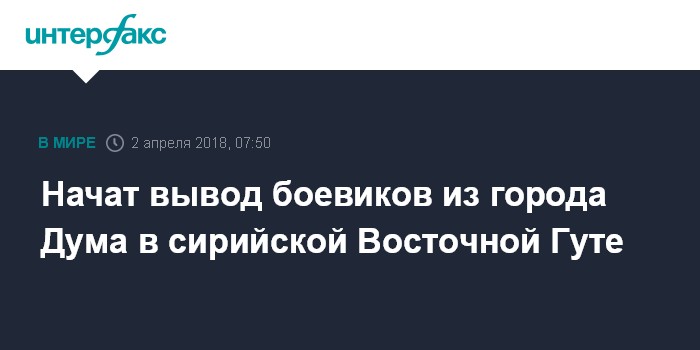 Москва. 2 апреля. INTERFAX.RU - Российские военные сообщили о начале вывода боевиков из города Дума (Восточная Гута, Сирия).