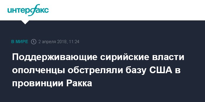 Москва. 2 апреля. INTERFAX.RU - Члены группировки "Сирийское сопротивление", лояльной властям Сирии, в понедельник сообщили о проведенном ими обстреле американской военной базы в провинции Ракка на севере Сирии, сообщает в понедельник межарабское издание "Аль-Масдар" со ссылкой на заявление группировки.