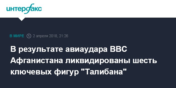 Москва. 2 апреля. INTERFAX.RU - Шесть ключевых фигур радикального движения "Талибан" (запрещено в России) вместе с 17 боевиками из элитного подразделения талибов "китъаи сурх" ("красная часть") уничтожены в ходе авиаудара ВВС Афганистана на территории приграничного с Таджикистаном уезда Дашт-и-Арчи северо-восточной провинции Кундуз, сообщил в понедельник штаб 209 корпуса афганской национальной армии "Шохин".