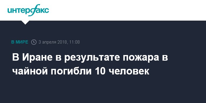 Москва. 3 апреля. INTERFAX.RU - Не менее 10 человек погибли, шестеро пострадали во вторник на юго-западе Ирана в результате пожара в чайной, сообщает агентство "Тасним".