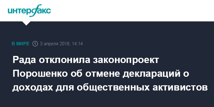 Москва. 3 апреля. INTERFAX.RU - Верховная рада Украины отклонила в первом чтении президентский законопроект №6674 и законопроект №6271 (один из авторов - лидер фракции "Батькивщина" Юлия Тимошенко), которые предлагали отменить для общественных активистов е-декларирование.