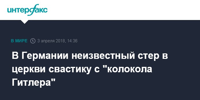 Москва. 3 апреля. INTERFAX.RU - Неизвестный проник в один из храмов федеральной земли Нижняя Саксония и стер свастику с так называемого "колокола Гитлера", сообщает во вторник радиостанция Deutsche Welle.