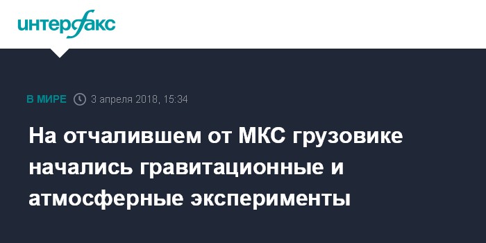Москва. 3 апреля. INTERFAX.RU - Космический грузовик "Прогресс МС-07" после отчаливания от Международной космической станции стал площадкой для гравитационных и атмосферных экспериментов, сообщил "Интерфаксу" источник в ракетно-космической отрасли.