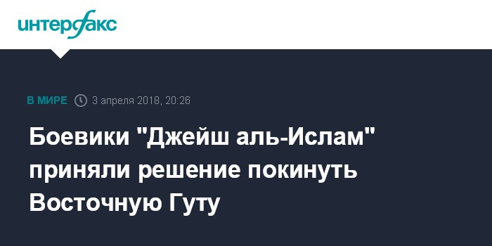 "На сегодняшний день достигнута предварительная договоренность о выходе экстремистов группировки "Джейш аль-Ислам" из Восточной Гуты. В соответствии с требованиями российской стороны боевики при выходе из населенного пункта Дума должны представить карты минных полей и подземных тоннелей, добровольно разминировать здания, расчистить баррикады и основные маршруты движения транспорта", - сказал Евтушенко.