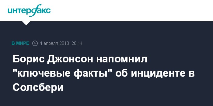 Москва. 4 апреля. INTERFAX.RU - Глава МИД Великобритании Борис Джонсон в среду напомнил "ключевые факты" об инциденте в Солсбери, среди которых он вновь указал на то, что у России был мотив для действий против экс-полковника ГРУ Сергея Скрипаля.