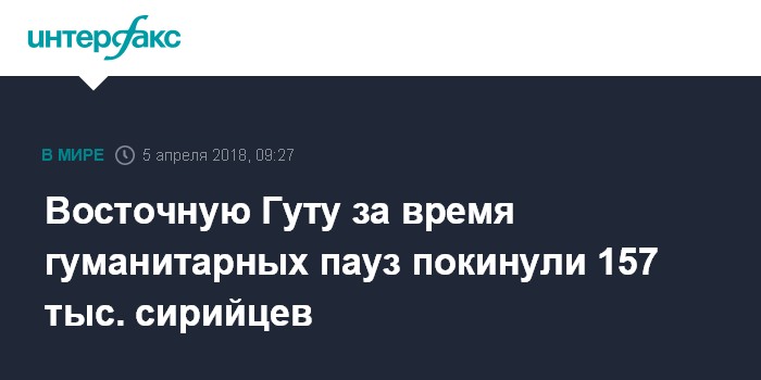 Москва. 5 апреля. INTERFAX.RU - Свыше 157 тысяч жителей покинули за все время гуманитарных пауз сирийскую Восточную Гуту, из них более 33 тысяч вышли из города Дума, сообщили в четверг в Минобороны РФ.