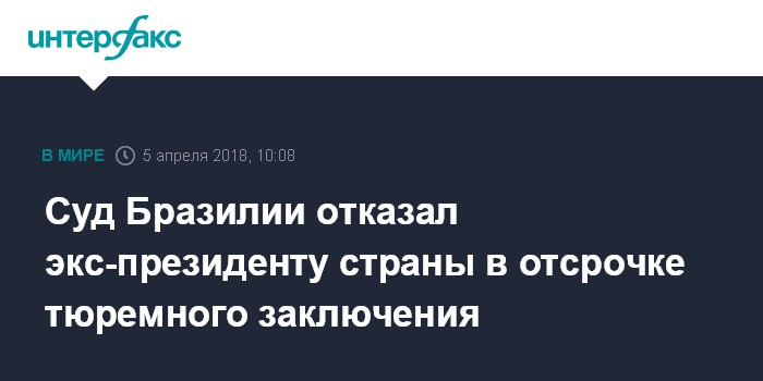 Москва. 5 апреля. INTERFAX.RU - Верховный суд Бразилии не удовлетворил апелляцию адвокатов бывшего президента страны Луиса Инасиу Лулы да Силвы, которого ранее приговорили к 12-летнему тюремному сроку за коррупцию, передают в четверг западные СМИ.