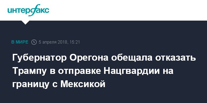 Москва. 5 апреля. INTERFAX.RU - Губернатор американского штата Орегон Кейт Браун заявила в четверг, что ответит отказом, если президент США Дональд Трамп попросит ее задействовать войска Национальной гвардии из этого штата для усиления охраны границы между США и Мексикой.