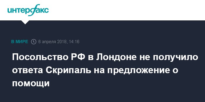 Москва. 6 апреля. INTERFAX.RU - Посольство России в Великобритании пока не получило ответа Юлии Скрипаль на предложение о консульской поддержке.