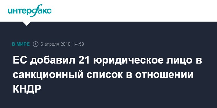 Москва. 6 апреля. INTERFAX.RU - Евросоюз в рамках исполнения резолюций СБ ООН в отношении КНДР внес дополнительно в свои санкционные списки 21 структуру и одно физическое лицо, имеющие отношения к КНДР, говорится в сообщении Совета ЕС.