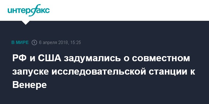Москва. 6 апреля. INTERFAX.RU - Россия совместно с США изучает возможность запуска новой межпланетной станции по исследованию Венеры, сообщает Роскосмос.