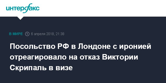 Москва. 6 апреля. INTERFAX.RU - В российском посольстве в Лондоне иронично встретили решение об отказе в визе племяннице отравленного в Солсбери экс-сотрудника ГРУ Сергея Скрипаля Виктории Скрипаль.