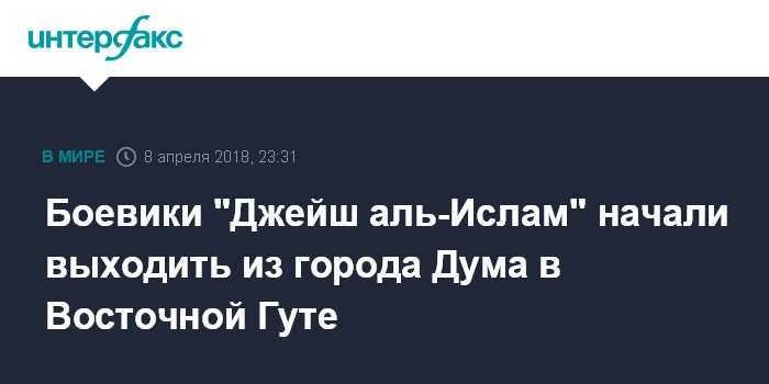 Москва. 8 апреля. INTERFAX.RU - Боевики группировки "Джейш аль-Ислам" начали выходить из города Дума (сирийская Восточная Гута) через пункт пропуска в Мухайям Аль-Вафедине, сообщили в Минобороны РФ.