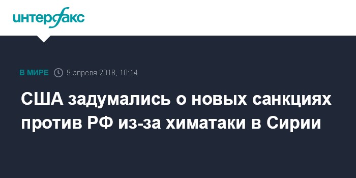 Москва. 9 апреля. INTERFAX.RU - В ближайшее время власти США обсудят новые санкции в отношении России, связанные с сообщениями о недавней химической атаке в Сирии, сообщает в понедельник газета "Коммерсантъ" со ссылкой на источник, близкий к Госдепу США.