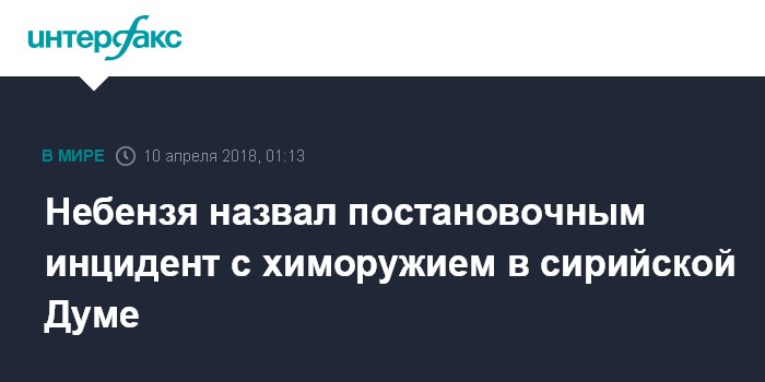 Москва. 10 апреля. INTERFAX.RU - Информация об использовании зарина или хлора в сирийском городе Дума 7 апреля не подтвержден, постановочный характер инцидента не вызывает сомнения, постпред РФ при ООН Василий Небензя.